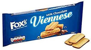 Fox’s Viennese Milk Chocolate ingredients: Wheat flour, milk chocolate, sugar, cocoa butter, dried whole milk, cocoa mass, dried whey (milk), vegetable fats, dried skimmed milk, emulsifier: soya, palm oil, sugar, butter, partially inverted refiners syrup, raising agents, flavourings, salt.